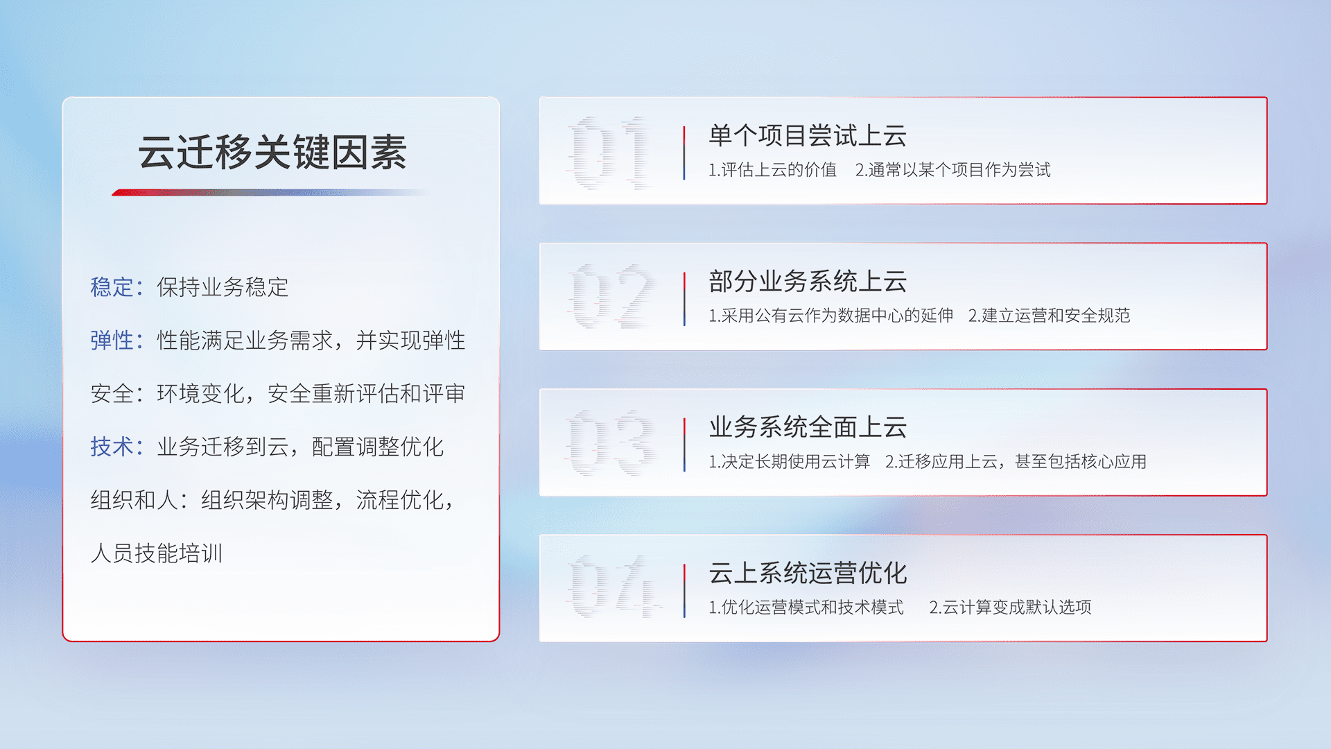 结合实际业务,,,从规划设计、、云平台选型、、、、云原生改造、、数据迁移、、、集成交付,,,迁移全过程为客户识别最佳上云路径,,,,做好风险识别管理,,,,设计网络架构、、、、身份权限、、、、安全审计合规、、、操作审计、、日志审计、、、监控告警策略、、、多站点容灾设计等,,,对云上基础设施进行整体规划,,,提升IT治理水平,,以满足弹性、、高可用、、高性能的需求。。。。