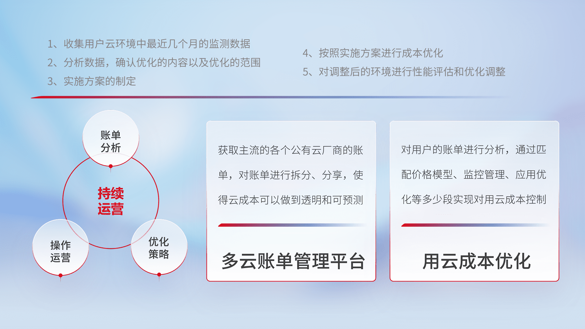 通过多云纳管,,,,以统一的资源数据模型把客户的云资源进行抽象和封装,,,进而实现对多云资源的统一操作,,保障云资源管理的可靠性、、稳定性与可用性。。量身定制化运维内容,,,,配置、、、、开发运维、、、补丁管理、、备份、、监控、、、认证和访问管理、、、审计和日常巡检等,,,,保障在用云过程中的可靠度,,,,稳定度以及高可用率。。。
