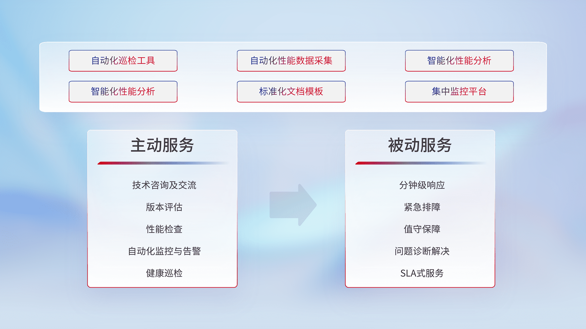 智能化工具和标准化文档,,,保障服务质量,,,提供主动服务(包含技术咨询、、、、版本评估、、性能检查、、、自动化监控与告警、、、、健康巡检)和被动服务包含(分钟级响应、、、紧急排障、、值守保障、、问题诊断解决、、SLA服务)。。。